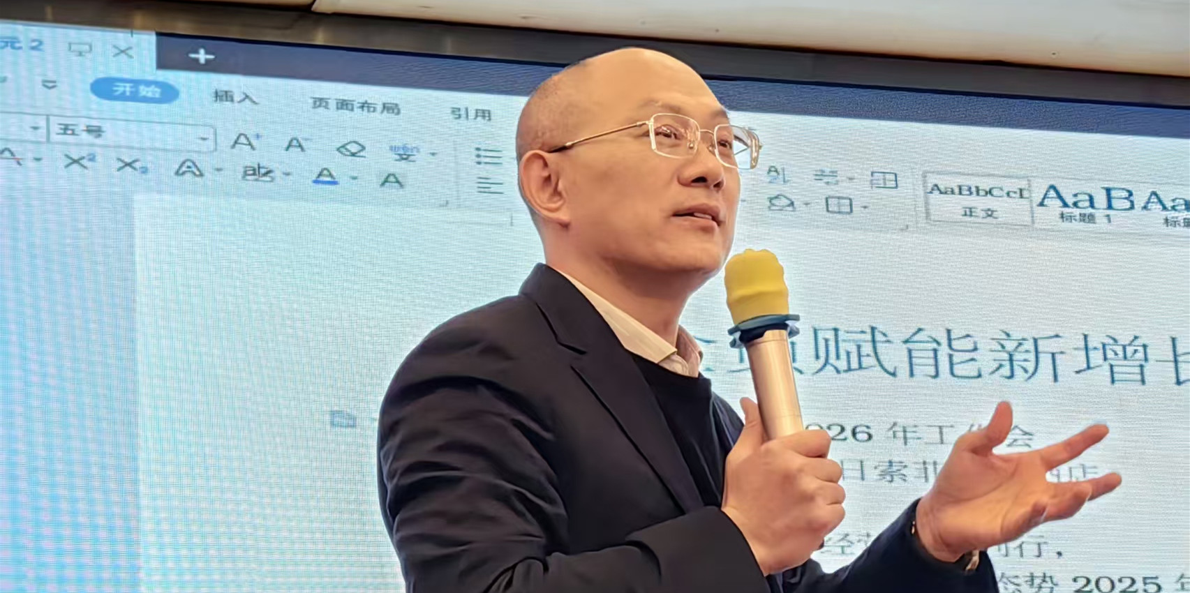 公司董事长、总经理童总对各部门总结作出点评并提出2026年工作要求,随后作题目为《全员赋能新增长 齐心共创新纪元》的主题演讲。